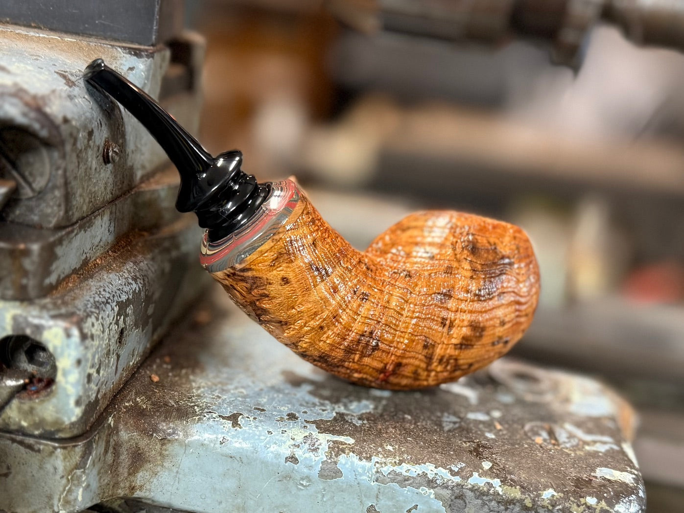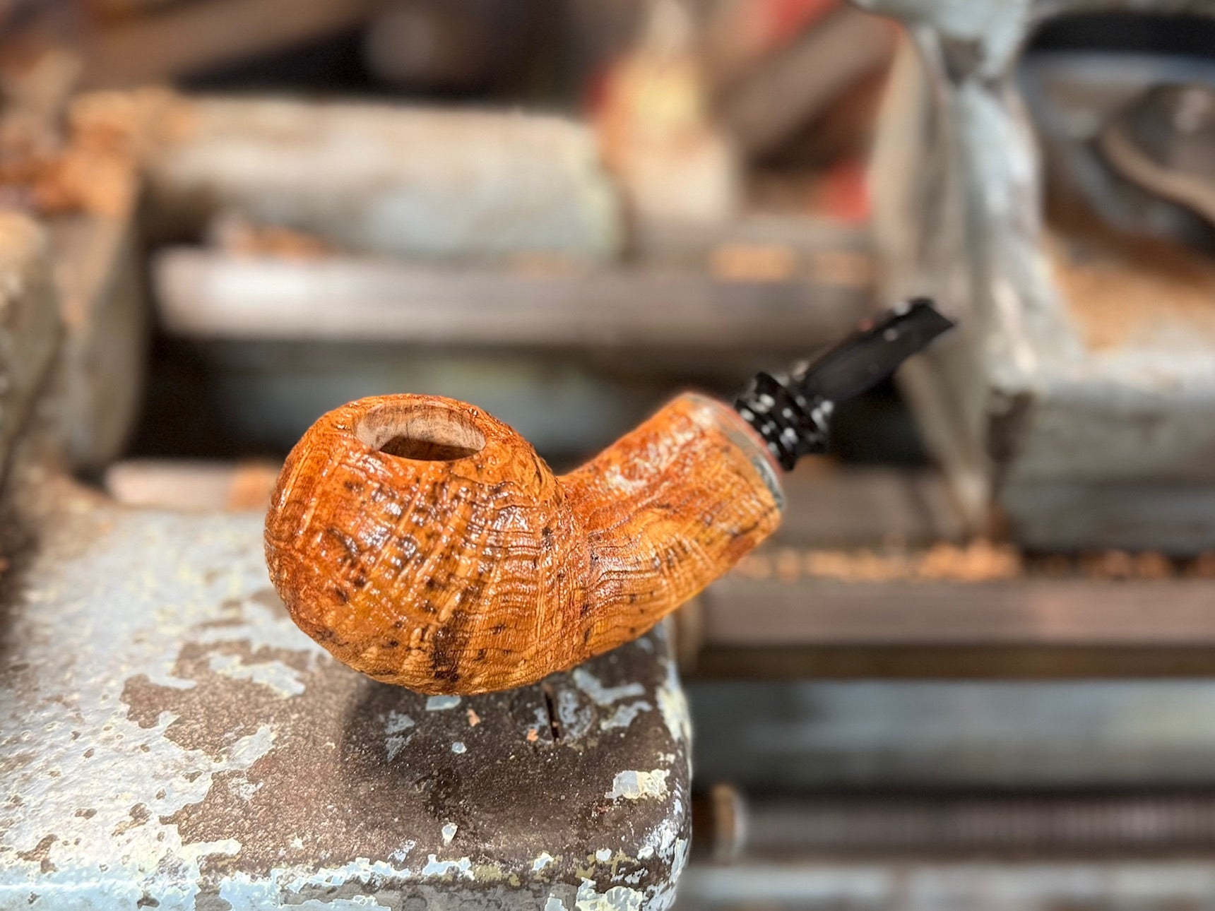 This chunky Arbutus RC is truly a sight to behold. The Arbutus used for this pipe is thoroughly speckled with natural mineral deposits. It creates an exceptionally eye catching finish. The wood has been sharply sandblasted to relieve gorgeous texture. A very special piece of rare Cumberland adornes the mouth of the generous RC chamber forming a tight military mount-like seal with the thin cut German ebonite stem. This is a truly special piece.